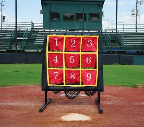 The perfect tool for developing and analyzing pitch accuracy. This tool allows for individualized workouts as well one-on-one bullpen sessions. This product comes with numbered targets that attach to the padding as to give an even better visual aid for the pitcher and coach so they know which pocket the ball goes into. The 9-Hole Pitch Target forces the pitcher to aim for the corners as they are pitching. The #60 netting and padded frame ensure the products durability and can withstand 90+mph pitching.