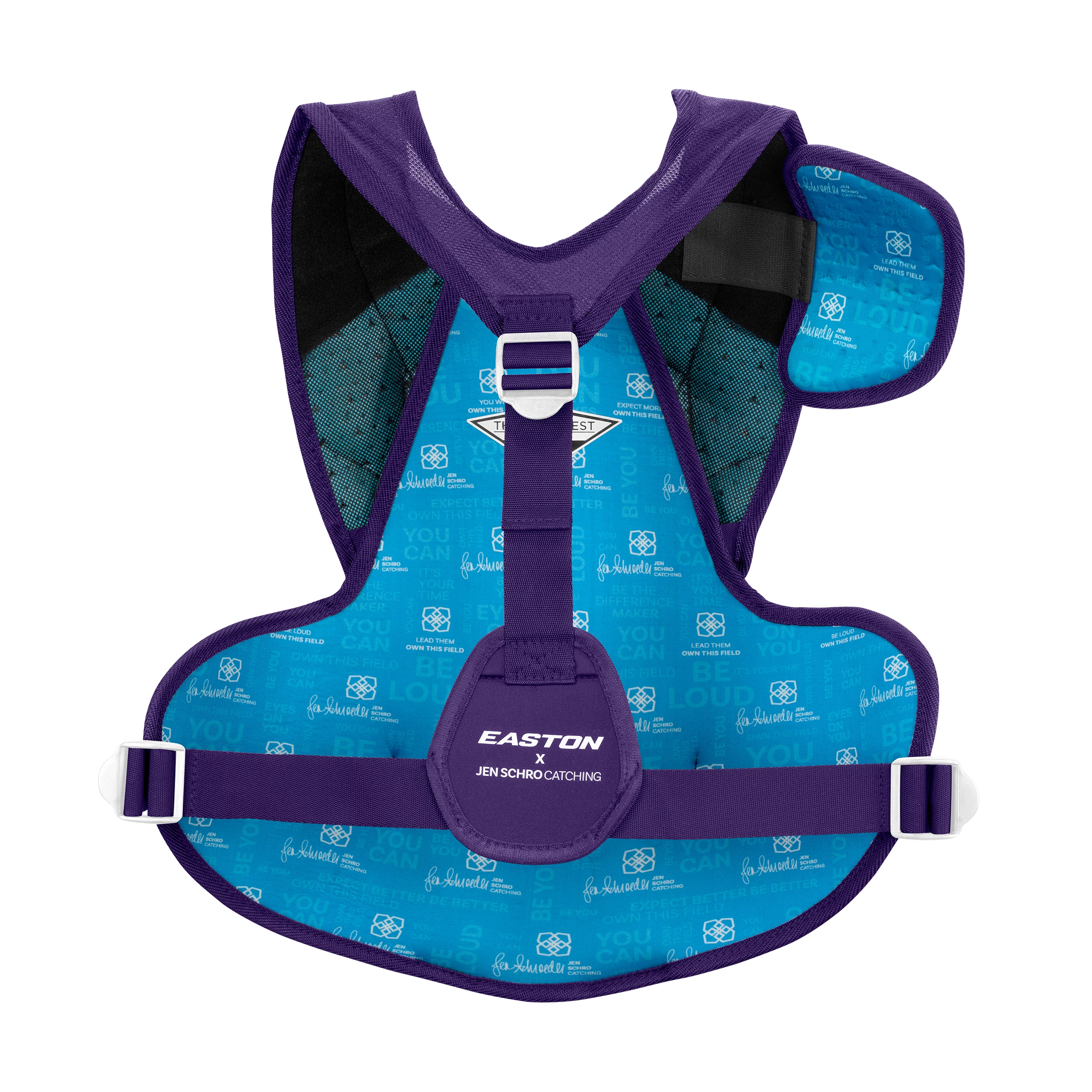 The revolutionary Very Best™ Chest Protector from Easton x Jen Schro is made specifically to inspire and protect fastpitch catchers. Form-fit for the female athlete, The Very Best™ Chest Protector is designed with a new chest silhouette to provide the best fit, mobility and protection for fastpitch catchers. Two-piece design with narrowed shoulders and slimming ab area has more memory foam for better protection and blocking. Compression-molded, neoprene second layer is shaped to wrap the waist and sit underneath the chest for better comfort. Mesh over the shoulders for breathability, comfort and weight management. Improved neck and collarbone guard for more protection. Patent-pending silicone- grip abs for reduced spin on blocked balls. Three-way easy tightening system with dual-plastic buckles.